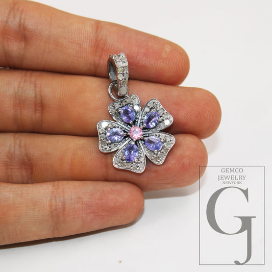 Shiny silver natural tanzanite floral pendant designer Rosecut pave diamond pendant 925 sterling silver handmade diamond necklace pendent
