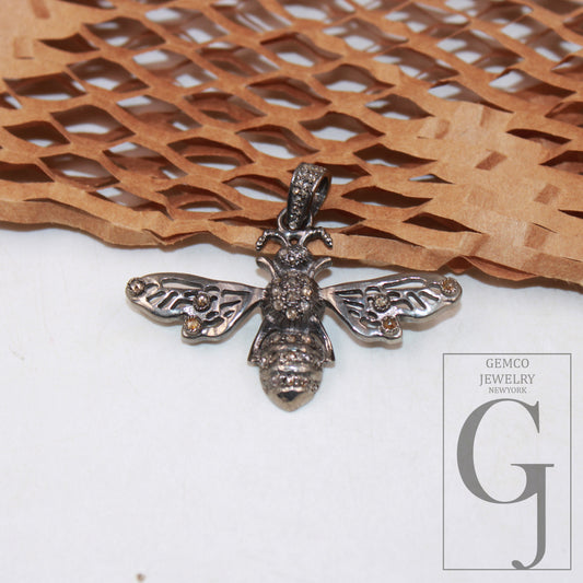 Antique Look Oxidized Bee Pendant Designer Rosecut Pave Diamond Pendant 925 Sterling Silver Handmade Finish Diamond Jewelry Necklace Pendant