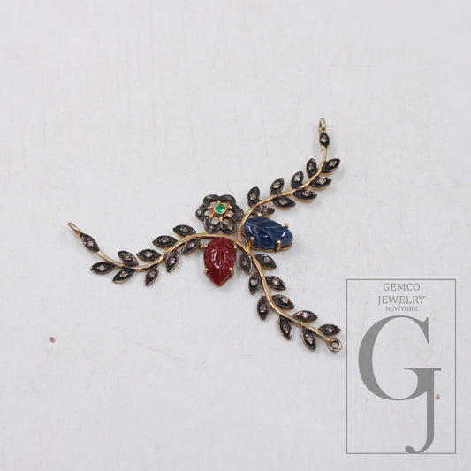 Ruby & Blue Sapphire Leaf Designer Diamond Pendant Rosecut Diamond Pendant Sterling Silver Handmade Finish Diamond Necklace Pendant Jewelry
