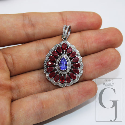 Silver finish Tanzanite and Ruby pendant designer Rosecut pave diamond pendant sterling 925 silver handmade finish diamond necklace pendant