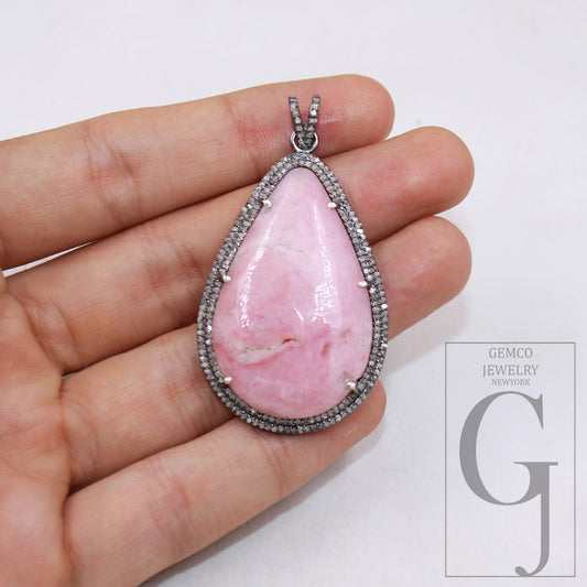1Pcs Beautiful Pink Opal Pendant Necklace Rose Cut Pave Diamond 925 Sterling Silver Handmade Finish Pave Diamond Charm Pendant Necklace