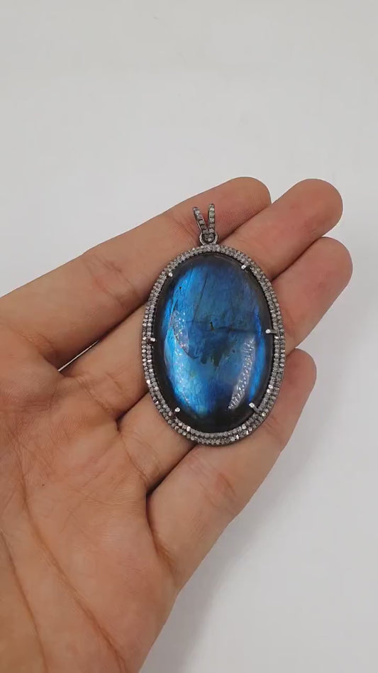 1pc Oxidized Designer Labradorite Pendant Rosecut Pave Diamond Pendant 925 Sterling Silver Handmade Finish Diamond Charms Necklace Pendant