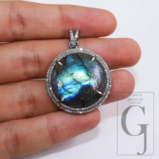 1pc Round Natural Labradorite Pendant Designer Rosecut Pave Diamond 925 Sterling Silver Handmade Finish Pendant Diamond Charm Necklace