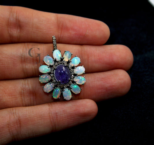 Beautiful Opal Tanzanite Pendant Designer Rosecut Pave Diamond Pendant 925 Sterling Silver Handmade Finish Diamond Charms Necklace Pendant