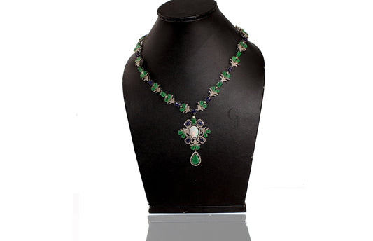 Very Beautiful Emerald, Sapphire , Opal Necklace Rosecut Pave Diamond Necklace Handmade 925 Sterling Silver Finish Diamond Necklace Earring