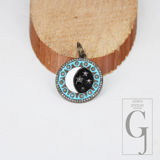 Antique Finish Designer Moon Star Enameling Rosecut Pave Diamond Pendant 925 Sterling Silver Handmade Finish Diamond Charm Necklace Pendant