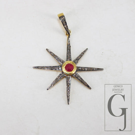 Starburst ruby red pendant Pave diamond rosecut pendant 925 sterling silver pendant handmade pendant Diamond Star RoseCut Charm pendant