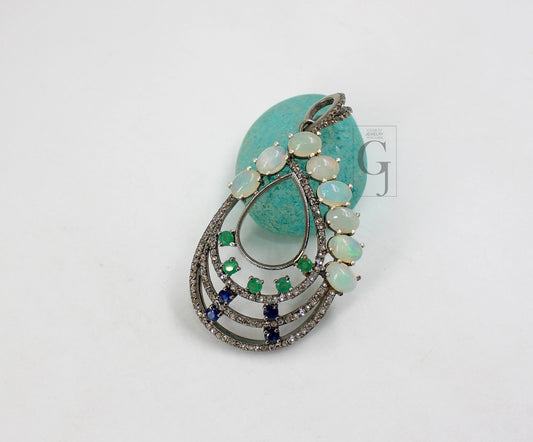Beautiful Opal, Blue Sapphire, Emerald, Pendant Rosecut Pave Diamond Pendant Silver Handmade Finish Diamond Charms Necklace Pendant