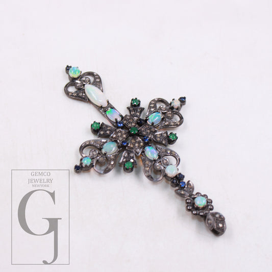 Antique Look Fire Opal Pendant Rosecut Pave Diamond Pendant Silver Handmade Finish Diamond Blue Sapphire Emerald Necklace Pendant Jewelry