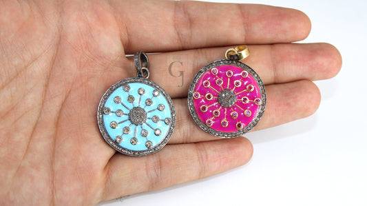 Beautiful Enameling Sunburst Pendant Designer Rosecut Pave Diamond Pendant Sterling 925 Silver Handmade Finish Diamond Necklace Pendant