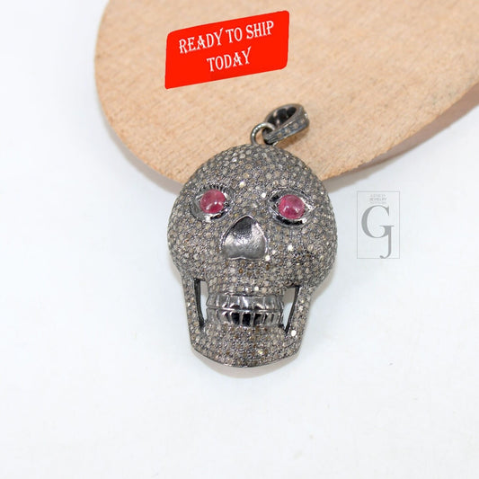 Antique look skull pendant ruby eyes design Rosecut pave diamond pendant 925 sterling silver handmade finish diamond ruby jewelry pendant