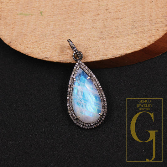 Oxidized Look Rainbow Moonstone Pendant Rosecut Pave Diamond Pendant 925 Sterling Silver Handmade Finish Diamond Charms Necklace Pendant