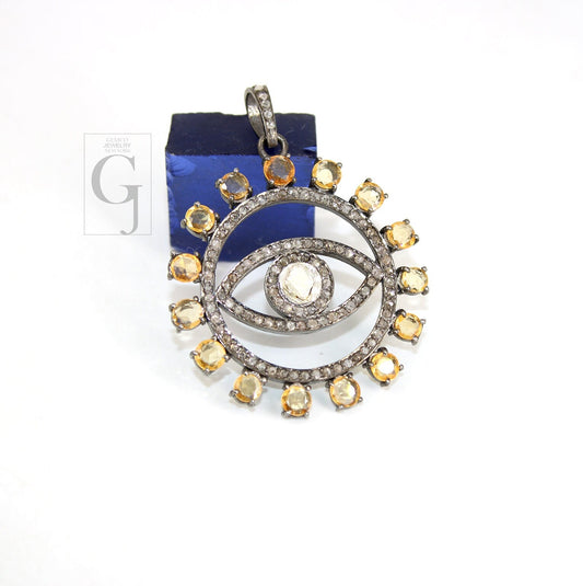 Polki Evil eye Citrin pendant designer Rosecut pave diamond pendant 925 sterling silver handmade finish diamond charm necklace pendant