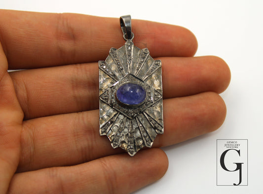 Antique Look Kyanite Pendant Rosecut Pave Diamond Pendant 925 Sterling Silver Handmade Finish Diamond Jewelry Necklace Pendant