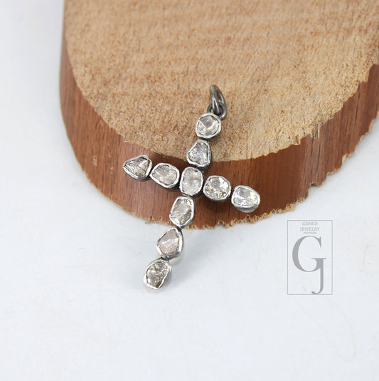 Antique Look Polki Cross Pendant Designer Rosecut Pave Diamond Pendant 925 Sterling Silver Handmade Finish Diamond Charms Necklace Pendant