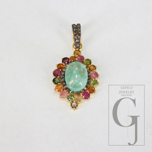 Emerald and multi tourmaline pendant designer Rosecut pave diamond pendant sterling 925 silver handmade finish diamond necklace pendant