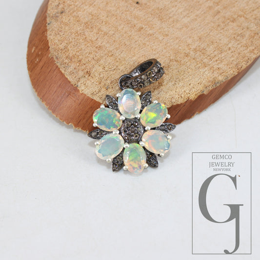 Beautiful Fire Opal Flower Pendant Rosecut Pave Diamond Pendant 925 Sterling Silver Handmade Finish Diamond Charms Necklace Pendant