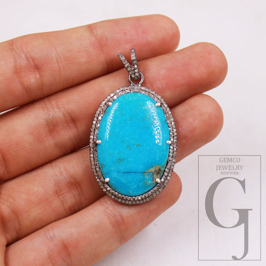 1pc Antique Turquoise Pendant Design Rosecut Pave Diamond Pendant Sterling Silver Handmade Finish Diamond Charm Necklace Pendant Jewelry