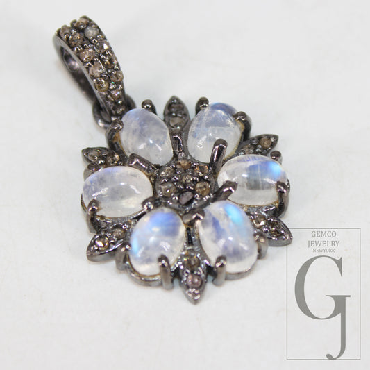 Beautiful Rainbow Moonstone Flower Pendant Rosecut Pave Diamond Pendant 925 Sterling Silver Handmade Finish Diamond Charms Necklace Pendant
