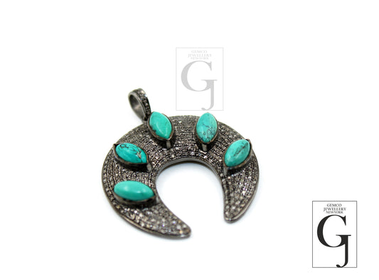 Antique Look Turquoise Crescent Moon Designer Pendant Rosecut Pave Diamond Pendant 925 Sterling Silver Handmade Finish Diamond Jewelry
