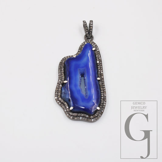 Blue druse natural agate pendant designer Rosecut pave diamond pendant 925 sterling silver handmade finish diamond charms necklace pendant