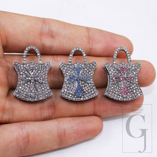 Antique Cross Design Pad Lock Pendant Pave Diamond Rosecut Pendant 925 Sterling Silver Pendant Handmade Diamond/Ruby/Sapphire Charm Jewelry