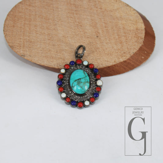 Beautiful Turquoise Designer Pendant Rosecut Pave Diamond Pendant 925 Sterling Silver Handmade Finish Diamond Charms Necklace Pendant