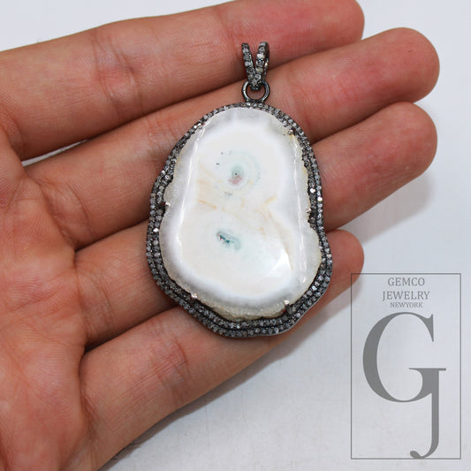 White SOLAR Agate Pendant Druzy Agate Slice Rosecut Pave Diamond Pendant 925 Sterling Silver Handmade Finish Diamond Charm Necklace Pendant