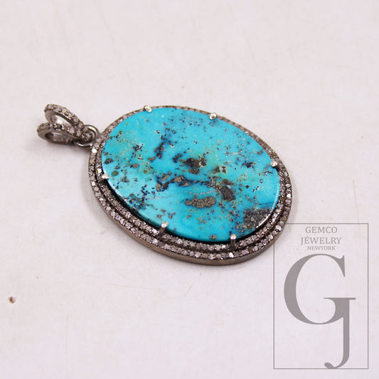 Antique Natural Turquoise Pendant Design Rosecut Pave Diamond Pendant Sterling Silver Handmade Finish Diamond Charm Necklace Pendant Jewelry