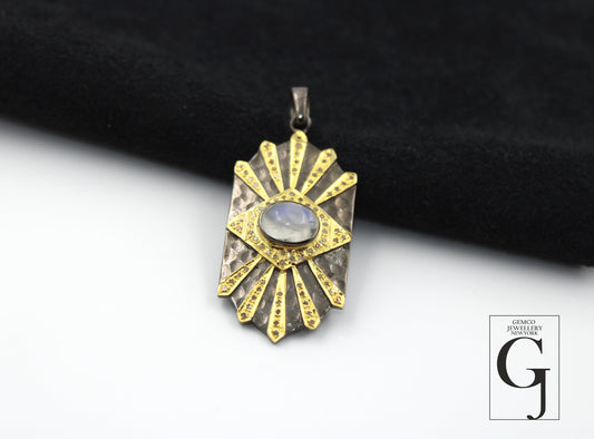 Antique Look Moonstone Designer Pendant 14k Rosecut Pave Diamond Pendant 925 Sterling Silver Handmade Finish Diamond Charms Necklace Pendant