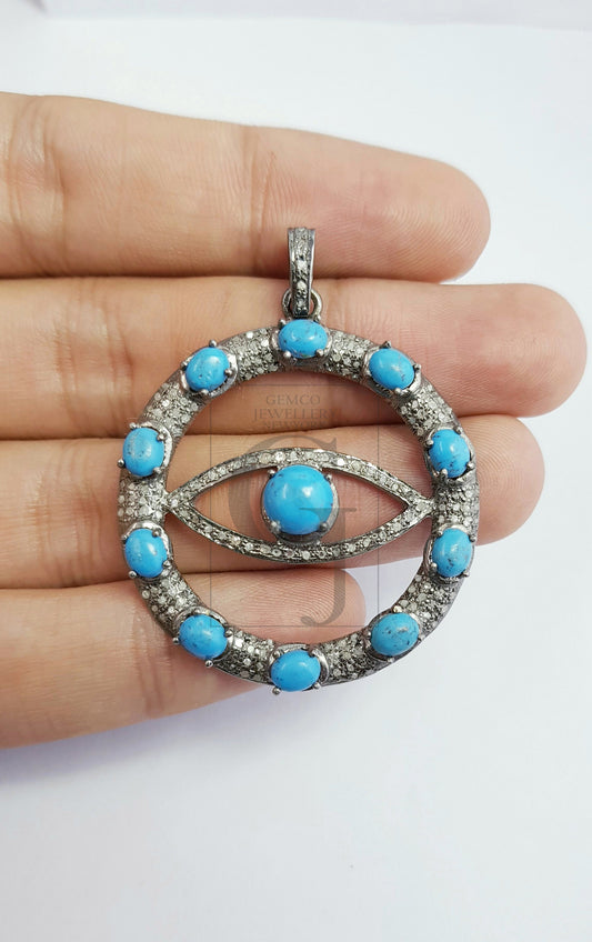Round oxidized evil eye design Rose cut pave diamond pendant 925 sterling silver handmade finish diamond color stone jewelry supplies