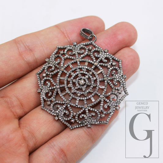1pc Oxidized Finish Snowflake Pave Diamond Rosecut Pendant 925 Sterling Silver Pendant Handmade Baguette Diamond Pendant Jewelry