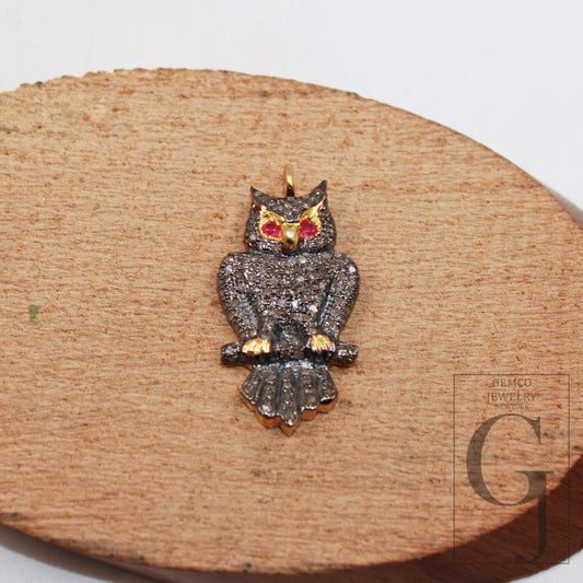 1pc Animal Figure Golden Owl Shaped Pendant Pave Diamond Rosecut Pendant 925 Sterling Silver Pendant Handmade Diamond Pendant Charm Jewelry