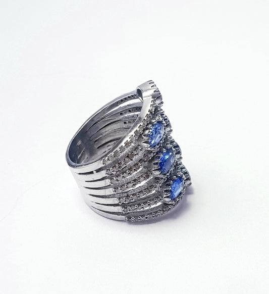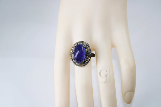 Bluesapphire colour natural kaynite stone Rocecut pave diamond rings 925 sterling silver handmade silver finish designer ring all size