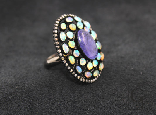 Very beautiful tanzanite and Opal designer ring Rosecut pave diamond rings 925 sterling silver handmade silver finish diamond ring
