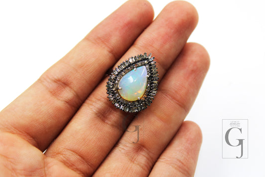 Teardrop design opal ring beautiful designer Rosecut pave diamond rings 925 sterling silver handmade silver finish diamond Baguette ring