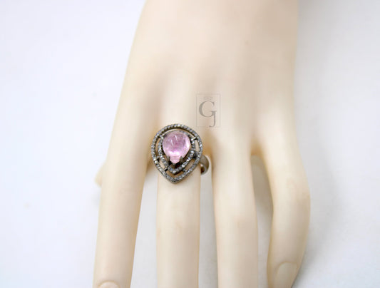 Beautiful teardrop shape pink tourmaline ring designer Rosecut pave diamond rings 925 sterling silver handmade silver finish diamond ring