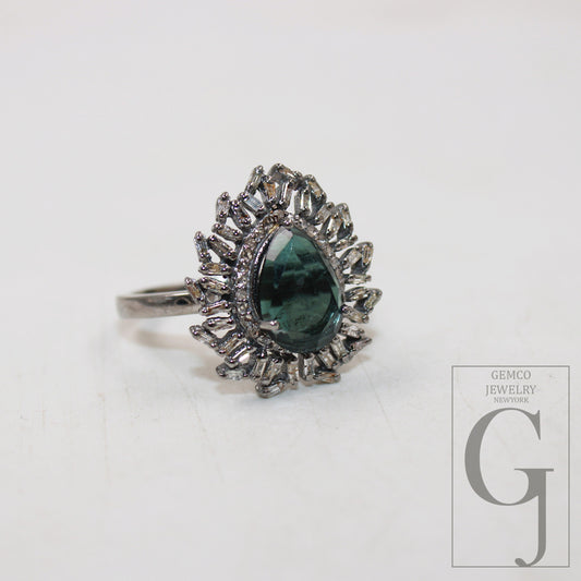 Beautiful Green Tourmaline Ring Designer Rosecut Pave Diamond Rings 925 Sterling Silver Handmade Silver Finish Baguette Diamond Ring Jewelry