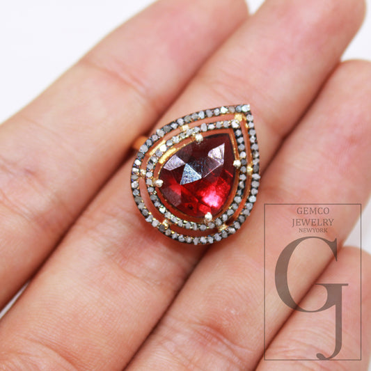 18k Gold Finish Designer Teardrop Rhodolite Ring Rosecut Pave Diamond Ring 925 Sterling Silver Handmade Silver Finish Diamond Ring Jewelry