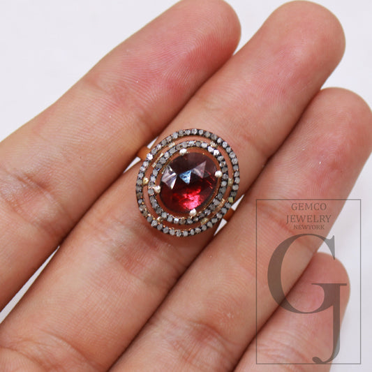 18k Gold Finish Designer Oval Shape Rhodolite Ring Rosecut Pave Diamond Rings Sterling Silver Handmade Silver Finish Diamond Ring Jewelry