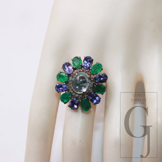 Aquamarine Emerald And Tanzanite Ring Designer Rosecut Pave Diamond Rings 925 Sterling Silver Handmade Silver Finish Diamond Ring Jewelry