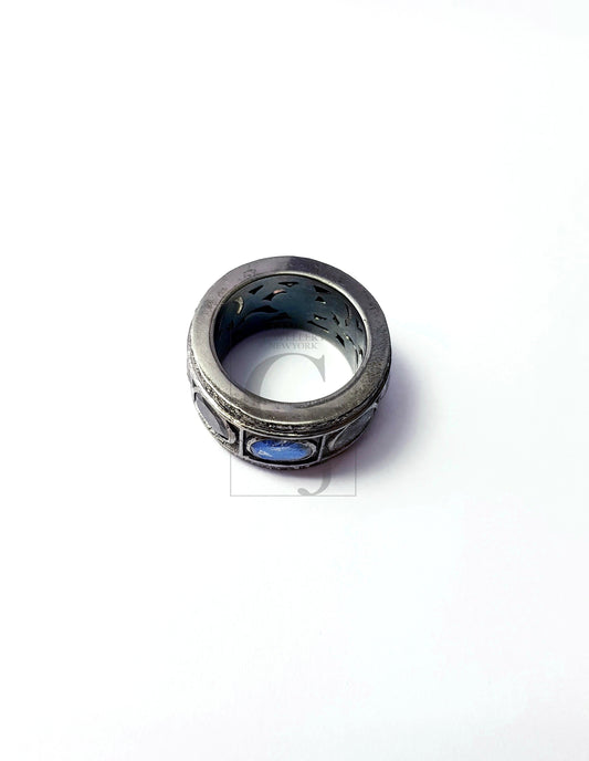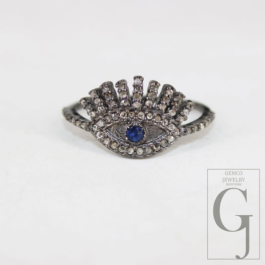 Antique Look Evil Eye Blue Sapphire Ring Designer Rosecut Pave Diamond Rings 925 Sterling Silver Handmade Silver Finish Diamond Ring
