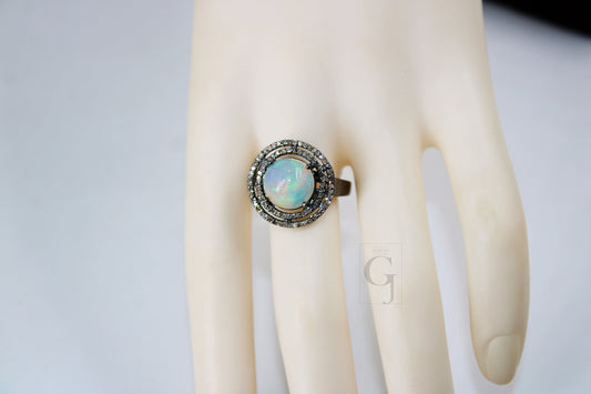 Antique Look Designer Natural Fire Opal Ring Rosecut Pave Diamond Rings 925 Sterling Silver Handmade Silver Finish Diamond Ring Jewelry