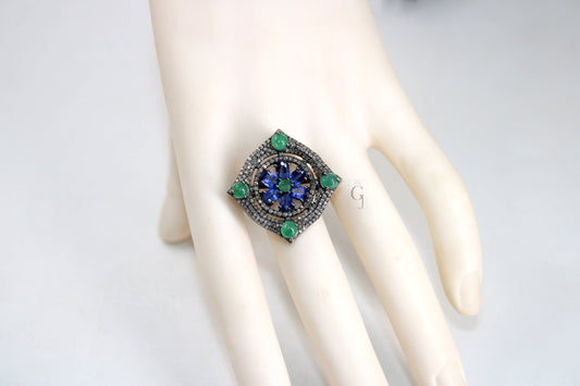Fashionable 18k gold designer natural emerald ring Rosecut pave diamond ring 925 sterling silver handmade silver finish diamond ring jewelry