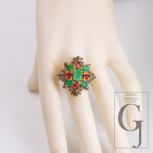 14k Gold Finish Green Emerald Ruby Ring Designer Rosecut Pave Diamond Rings 925 Sterling Silver Handmade Silver Finish Diamond Ring