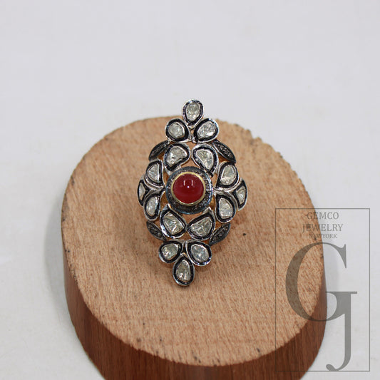 Red Ruby Victorian Style Flat Diamond Polki Ring Rosecut Pave Diamond Rings Sterling Silver Handmade Silver Finish Diamond Ring Ruby Jewelry