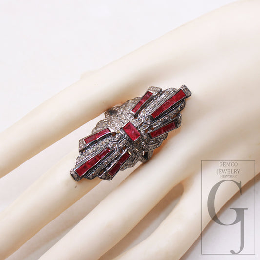 Beautiful Red Ruby Ring Designer Rosecut Pave Diamond Rings 925 Sterling Silver Handmade Silver Finish Ruby Diamond Statement Ring Jewelry