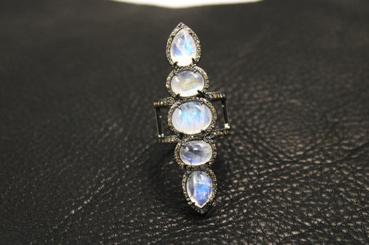 Very Beautiful Rainbow Moonstone Ring Designer Rosecut Pave Diamond Rings 925 Sterling Silver Handmade Silver Finish Diamond Ring