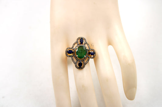 14k Gold Finish Emerald Sapphire Ring Designer Rosecut Pave Diamond Rings 925 Sterling Silver Handmade Silver Finish Diamond Ring