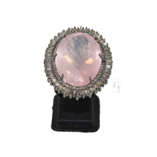 Beautiful Baguette Diamond Rose Quartz Ring Designer Rosecut Pave Diamond Rings 925 Sterling Silver Handmade Silver Finish Diamond Ring